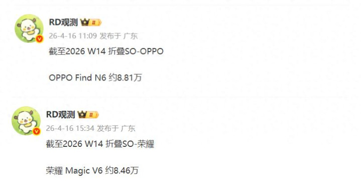 那么后续荣耀Magic V6产能的问题解决了吗?今天就给大家对比一下荣耀Magic V6、OPPO Find N6这两款上半年仅有横向大折叠销量数据。根据行业人士“RD观测”提供的数据,截至2026年W14周OPPO Find N6累计销量达到8.81万台,荣耀Magic V6的累计销量达到8.46万台。OPPO Find N6比荣耀Magic V6多出0.35万台。看似OPPO Find N6更受市场欢迎一些,但是我们不能这样简单对比,因为荣耀Magic V6首销时比OPPO Find N6低两万台多一点。所以我们结合W14周的销量来分析一下。